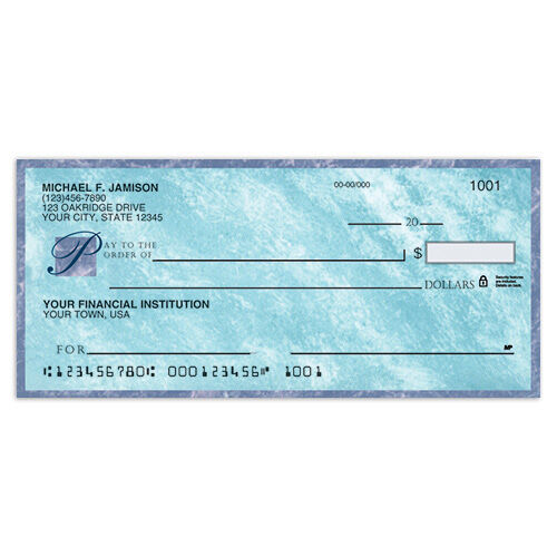 Neo-classic personal checks feature a timeless look with a marble pattern. Each pad of these classic and elegant personal checks includes four color variations of the patterned background: green, blue, pink and taupe.